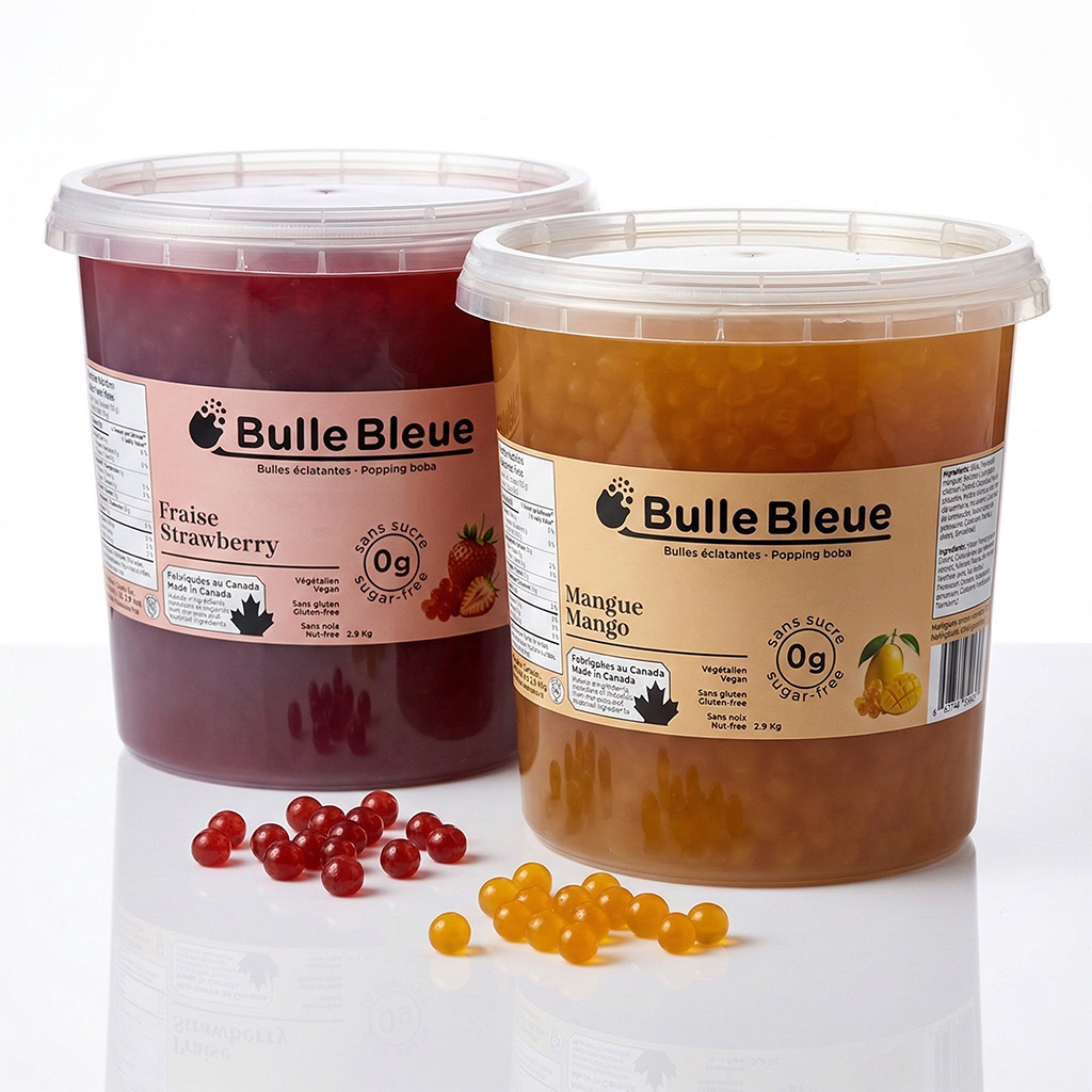 Redécouvrez vos saveurs préférées avec la gamme Sans Sucre de Bulle Bleue. Nous avons relevé le défi de créer une bulle éclatante (popping boba) qui conserve sa texture parfaite et son explosion de saveur fruitée, tout en affichant un compteur de sucre à zéro.